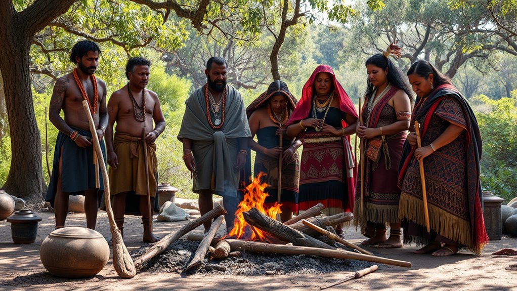 Aboriginal men’s and women’s business play crucial roles in ceremonies, guiding rituals that honor land, ancestors, and sacred laws. Men’s business often includes initiation, storytelling, and dance linked to spiritual beings, while women’s business focuses on childbirth, kinship, and community bonds. These practices preserve important knowledge and maintain harmony within the community and with the land. If you want to understand how these traditions uphold cultural identity, you’ll find more insights ahead.