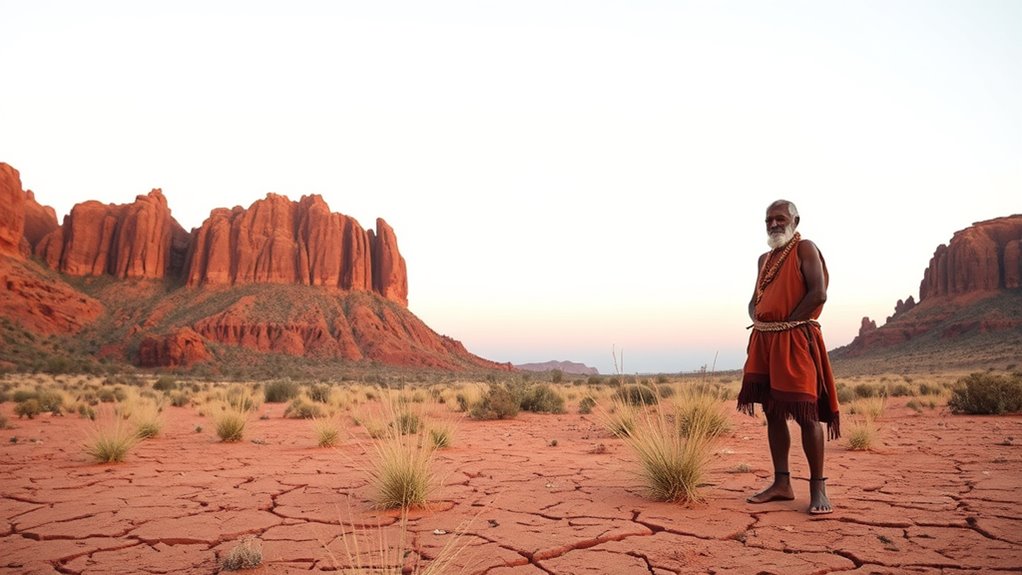 The Arrernte language reflects the sounds of Central Australia’s landscape, using phonetics that mimic natural elements like rustling leaves, wind, and desert animals. These unique sounds connect you to land, stories, and cultural traditions, embodying the environment’s spirit. When you listen closely, you’ll notice how the language’s structure encodes land-based stories and cultural identity. Keep exploring, and you’ll discover how these sounds serve as a living link to Arrernte heritage.
