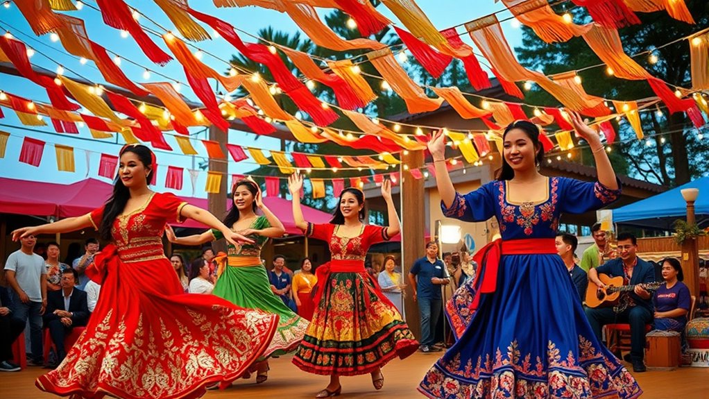 Song and dance festivals celebrate culture through lively performances that showcase local traditions, costumes, and cuisines. When you participate, you see how communities come together to preserve their history and identity through vibrant dances, soulful songs, and colorful attire. These festivals highlight regional flavors and stories, creating a joyful atmosphere that strengthens cultural bonds. If you keep exploring, you’ll discover even more about how these events reflect resilience and shared pride across generations.