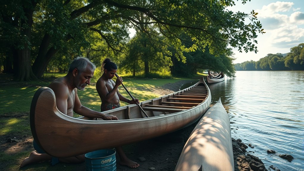 Sealing and decorating the canoe is equally important. Indigenous artisans often apply natural resins or plant-based substances to waterproof the vessel, a step that reflects their resourcefulness and harmony with nature. Decorative elements—patterns, symbols, and colors—are added to express stories, spiritual beliefs, or tribal affiliations. These embellishments transform the canoe into a cultural artifact, a moving symbol of community history. Building canoes this way isn’t simply about functionality; it’s a form of cultural preservation that strengthens the community’s ties to their land, sea country, and heritage. Through this craftsmanship, they continue to honor their ancestors’ knowledge, guaranteeing that these traditional skills endure for future generations, navigating not just waters but the very essence of their cultural identity. Additionally, the use of sustainable materials underscores their relationship with nature, ensuring the practice remains environmentally harmonious.