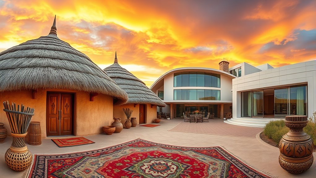 Traditional housing, from Indigenous Gunyas to Japanese Minka, reflects your community’s culture, environment, and history. These structures showcase unique craftsmanship, use local, sustainable materials, and incorporate eco-friendly design practices like natural ventilation and passive cooling. They promote harmony with nature while offering durable, cost-effective solutions rooted in centuries of experience. Exploring these styles reveals valuable lessons in balancing aesthetics, functionality, and sustainability—discover how these ancient methods influence modern architecture and your community’s identity.