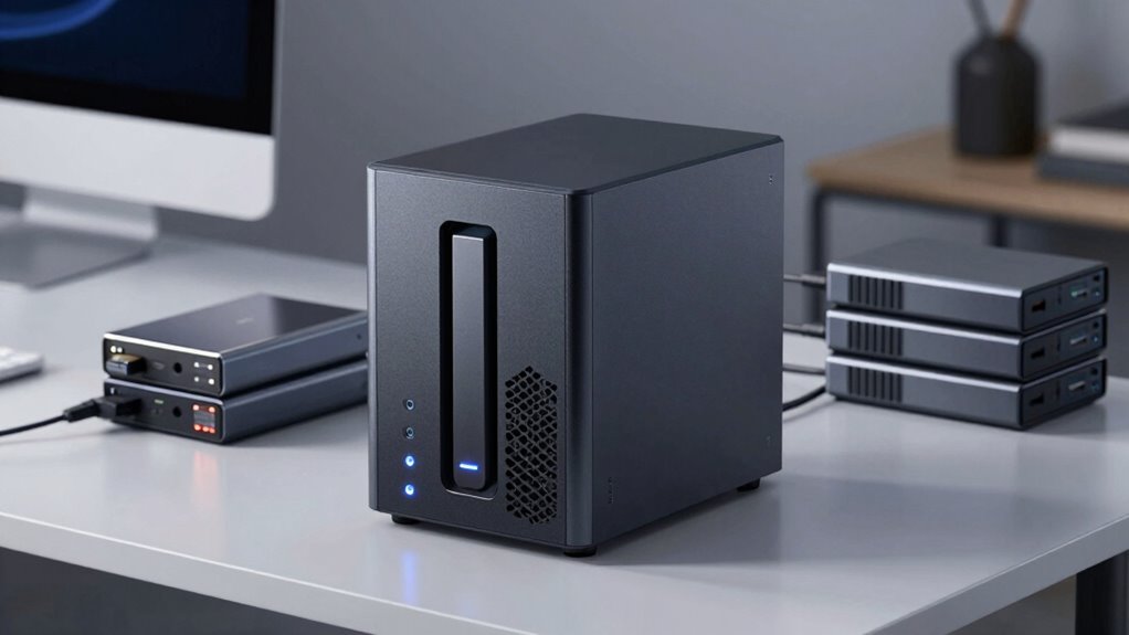 You’ll find that NAS devices generally consume more power than external drives because they run 24/7 and manage multiple drives. However, many modern NAS units are designed with energy efficiency in mind, reducing power consumption when idle. External drives, on the other hand, typically use less power and are more energy-efficient for occasional use. Your choice depends on balancing your need for continuous access versus conserving energy.
