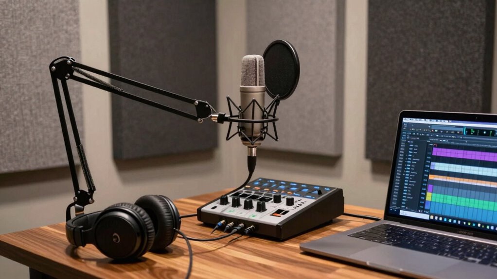 These techniques help control reflections and noise, giving your podcast a polished, professional sound without heavy investment. With a little creativity, you can markedly improve your portable studio’s acoustic quality.