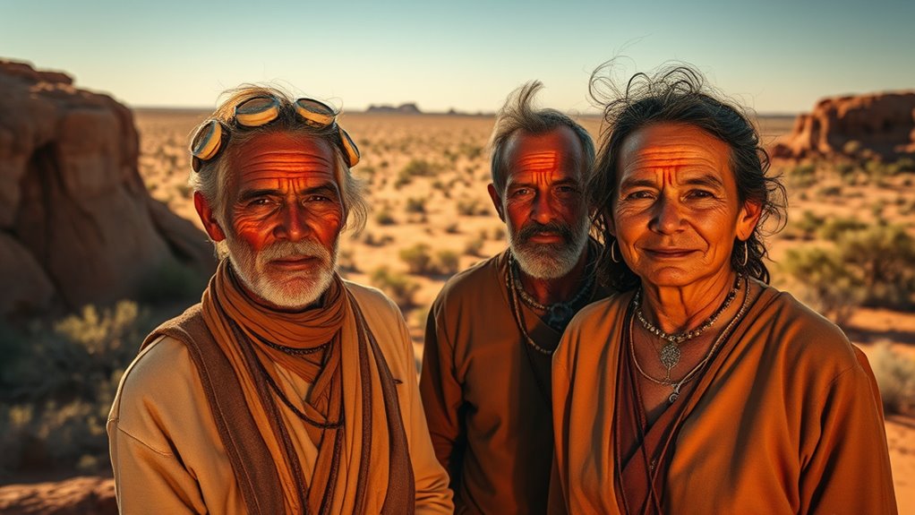 Have you ever wondered who the Martu people are? They’re an Indigenous group that has thrived for thousands of years in the harsh yet beautiful Western Desert of Australia. As you learn about them, you’ll discover that their connection to the land runs deep, shaping their culture, spirituality, and daily life. Central to their identity are Dreamtime stories—ancient narratives passed down through generations that explain the origins of the land, animals, and humans. These stories aren’t just tales; they’re the foundation of Martu spirituality and law, guiding how they live, hunt, and interact with their environment. When you hear their stories, you’ll notice how they serve as a living map of the land, anchoring their cultural identity and reminding them of their responsibilities to protect sacred sites and maintain balance with nature. Their traditional crafts also include weaving, carving, and making tools from bush materials, all of which require deep knowledge of the environment and respect for the land. These crafts are crucial expressions of their identity and resilience, helping them maintain a connection to their ancestors and the stories that define their culture. Living in one of the world’s most inhospitable landscapes, the Martu people have developed a profound understanding of their environment. They’ve learned to read the land’s subtle signs—tracks, plants, and water sources—that enable them to survive and thrive in the desert. Their cultural practices, including storytelling and crafting, are intertwined with their environmental knowledge. This relationship not only sustains their community but also positions them as custodians of the Western Desert’s sacred places. Their environmental knowledge is a vital part of their cultural survival and stewardship. When you consider their cultural practices, you realize that the Martu are more than just desert dwellers; they are protectors of their land’s stories, traditions, and ecosystems. Their resilience and dedication ensure that their heritage continues to flourish, even in the face of modern challenges.