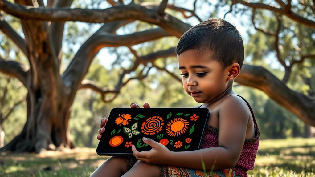 Discover how indigenous story apps transform traditional tales into engaging digital experiences that your kids will love. These apps use animations, sound effects, and interactive features to keep children connected to their culture while making learning fun. They teach important values like respect, community, and history through vivid storytelling and immersive tools. If you keep exploring, you’ll find creative ways to help your children appreciate and preserve their cultural heritage in contemporary ways.