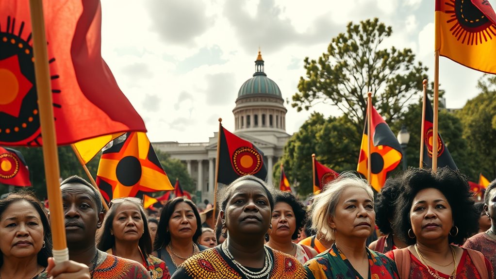 Over the decades, Aboriginal activism has shifted from isolated protests to a strong movement of resilience. You see communities fighting for sovereignty, land rights, and cultural revival through protests, court cases, and social media. These efforts challenge oppressive policies, restore dignity, and embrace traditions. Each victory builds momentum, showcasing resilience and empowerment. If you keep exploring, you’ll discover how Indigenous peoples continue to strengthen their voices and culture in the face of ongoing challenges.