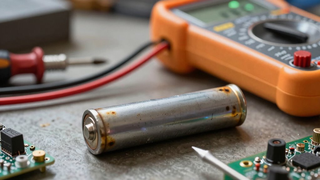 You’ll notice signs of internal battery corrosion or damage through visible leakage, such as a cloudy or crusty substance around the terminals. Battery leakage often causes corrosion signs like white or greenish deposits. If you see any of these, stop using the battery immediately, as continued use can damage your device. Regularly check your batteries for these signs to prevent internal damage and maintain device safety.