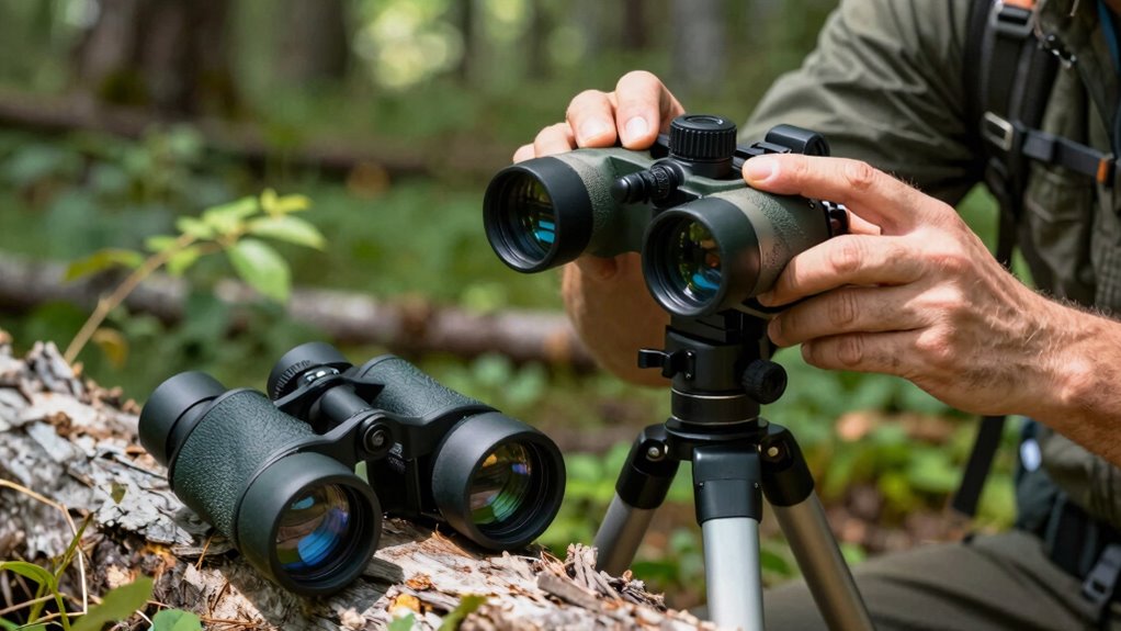 Imagine carrying a feather or a boulder; your choice affects your journey. Weight considerations are vital when choosing between binoculars and spotting scopes. Opt for ergonomic design that feels light and balanced, making extended use comfortable. If you’re hiking or moving constantly, lighter binoculars help you stay agile. Spotting scopes tend to be heavier, so consider their weight carefully to prevent fatigue and guarantee steady viewing during long sessions.