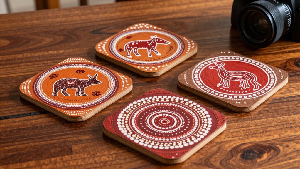 Authentic Aboriginal art coasters are usually made from durable materials like wood, ceramic, or cork. I find that wood coasters often showcase intricate carvings or painted designs, while ceramic ones feature vibrant, detailed artwork. Cork is a popular choice for its practicality and rustic look. These materials not only preserve the traditional artistry but also guarantee the coasters last, making them both beautiful and functional for your decor.