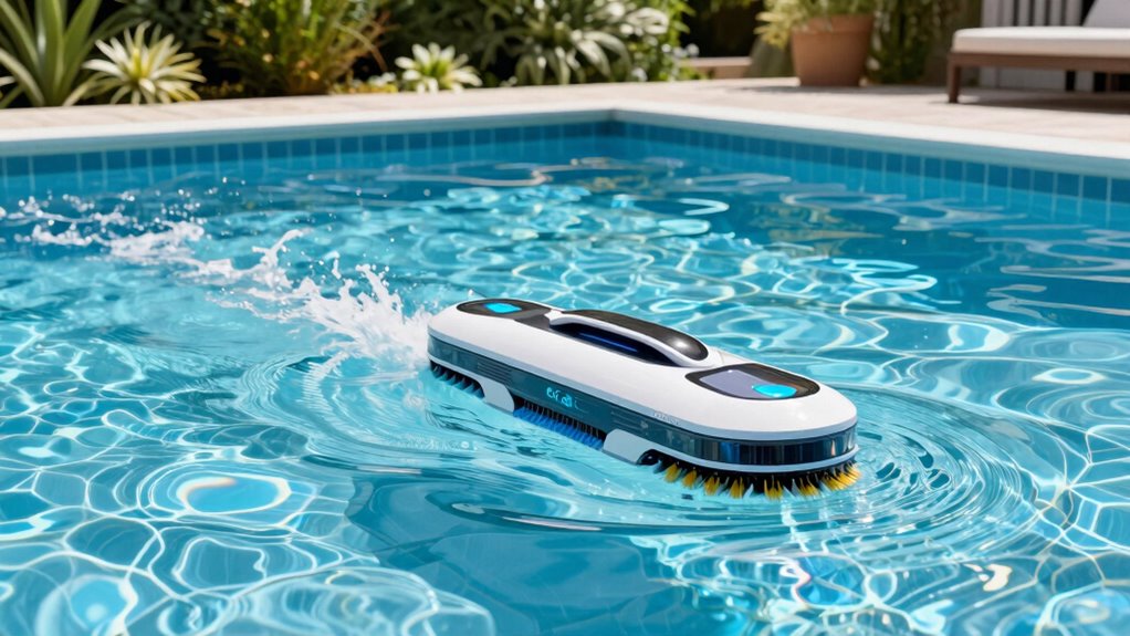 Navigation technology plays a crucial role in ensuring your pool cleaner covers every inch of your pool efficiently. Advanced systems like ultrasonic sensors, gyroscopes, and smart path planning improve coverage accuracy and cut down cleaning time. Instead of relying on random movement algorithms, which can miss spots, systematic navigation ensures thorough cleaning. These intelligent features adapt to various pool shapes and obstacles, making it easier to clean irregular or complex layouts. Auto-mapping and zone cleaning allow the cleaner to focus on specific areas, optimizing performance based on your pool’s size and shape. Good navigation technology minimizes missed spots and reduces overall cleaning time, giving you a more efficient and effective cleaning experience. When choosing a pool cleaner, prioritize models with advanced navigation features for best results.