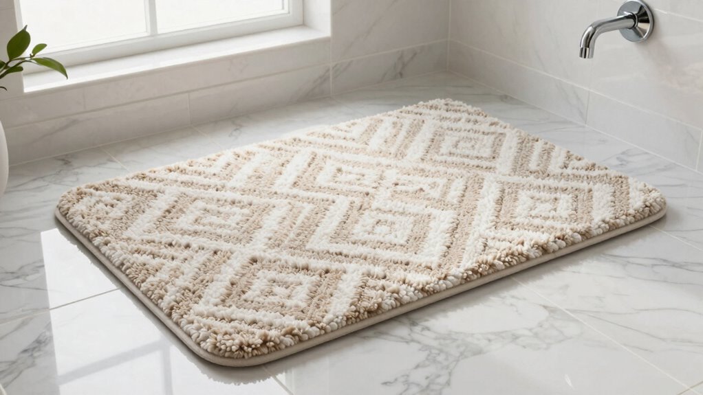 To prevent slips and falls in the bathroom, focusing on the slip-resistant features of bath mats is essential. Look for mats with textured rubber or PVC backing, which creates friction between the rug and the floor to reduce slipping. Enhanced designs like diamond-tread patterns or suction cups can grip the surface more securely. Safety standards often require testing grip strength on wet surfaces to guarantee reliability. However, proper placement is key—keep the bottom of the mat dry, as water underneath can compromise its grip. Regularly inspect and clean the non-slip backing to maintain its effectiveness. By choosing a mat with these features, you’ll improve safety without sacrificing style, making your bathroom both chic and secure.