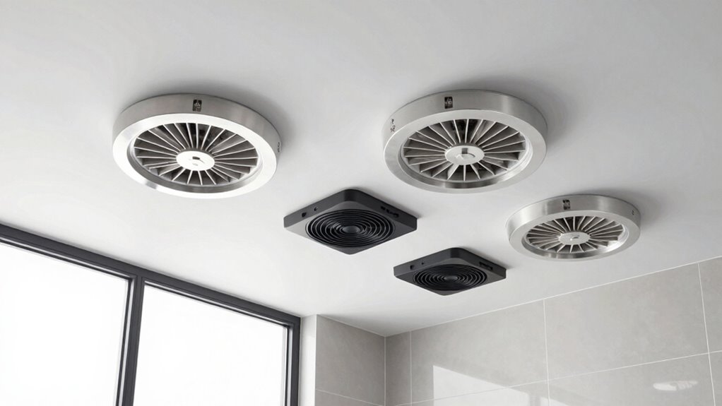 Ever wondered how to guarantee your bathroom exhaust fan not only keeps the air fresh but also saves on energy bills? The key is to look for ENERGY STAR certification, which assures the fan meets strict energy efficiency standards and uses less power. Fans with higher airflow ratings (measured in CFM) can be more effective while operating at lower energy levels, boosting efficiency. Adjustable or variable speed fans help match ventilation to real moisture or odor levels, preventing wasteful overuse. Modern motors like DC or ECM models provide higher efficiency and consume less electricity compared to traditional AC motors. Proper duct installation and sealing are also essential, as they minimize air leaks and prevent unnecessary energy loss, making sure your fan works efficiently and cost-effectively.
