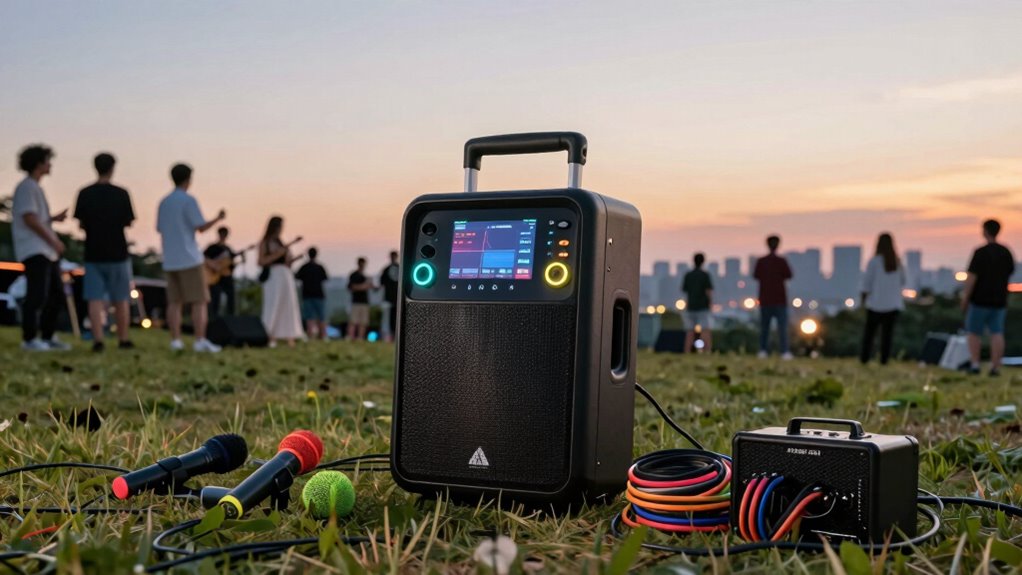 Portability and weight are essential factors because they determine how easily I can transport and set up a battery-powered PA system in remote locations. Lighter systems, typically weighing between 10 to 30 pounds, are much easier to carry over long distances, especially when I don’t have assistance. Portable designs with built-in handles and wheels make the process even smoother, reducing physical strain and saving time. Compact models fit easily into backpacks or small vehicles, which is perfect for quick setup in tight spaces. Heavier systems, over 50 pounds, often require extra support or multiple people to move safely. Overall, a lightweight, well-designed PA system with portable features guarantees I can quickly and effortlessly set up anywhere, making my remote gatherings more manageable.