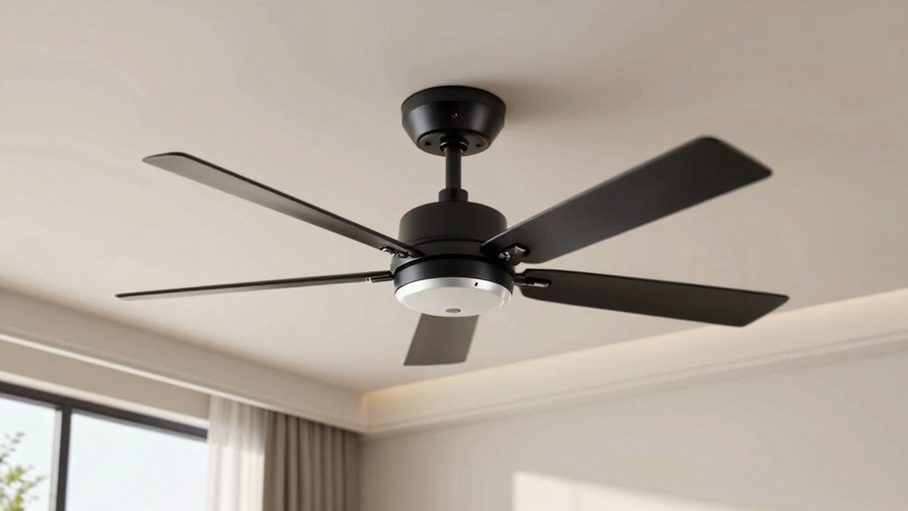 Control mechanisms substantially impact how easily you can operate your ceiling fan and tailor its settings to your preferences. Remote controls are popular for their convenience, allowing adjustments of fan speed, light dimming, and timers from across the room. Smartphone apps take this further, offering customization, scheduling, and integration with voice assistants for hands-free control. Wall switches are straightforward, usually handling basic on/off functions, but they can sometimes connect with remotes or apps for added convenience. When choosing a control method, consider how it fits into your daily routine and existing smart home setup. A system that’s intuitive and compatible will make managing your fan effortless, ensuring you stay comfortable without hassle.