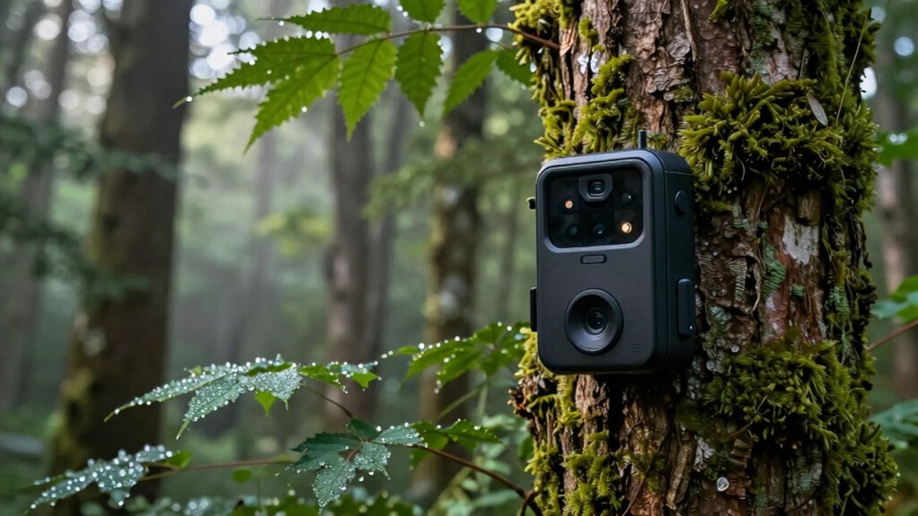 Ensuring your cellular trail camera can withstand the rigors of outdoor environments is essential for reliable remote monitoring. Look for models with an IP66 or higher waterproof rating to handle heavy rain, snow, and dust. A reinforced casing made of rugged materials like aluminum or high-impact plastic adds resistance to impacts and rough handling. Weather-resistant seals around buttons, ports, and the lens protect internal components from moisture, dirt, and debris. Check that the camera operates within a wide temperature range, typically from -20°F to 122°F, to guarantee performance in extreme conditions. Additionally, a shockproof design helps the camera endure drops and vibrations common in remote outdoor settings. These durability features are critical for long-lasting, dependable outdoor use.