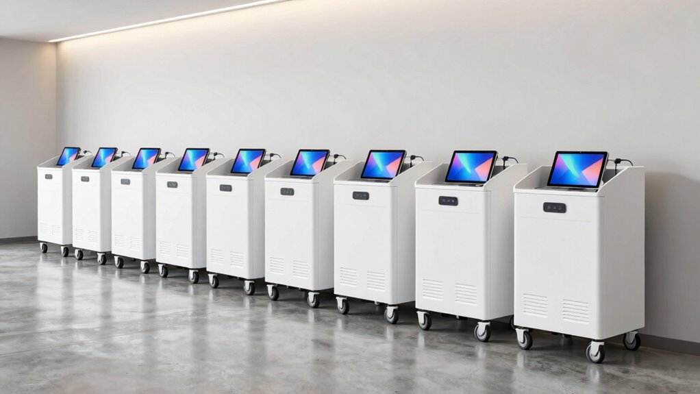 If you’re looking for the 15 best charging carts for tablets in schools in 2026, I’ve got you covered. I’ve researched models that support multiple devices, guarantee security, and promote efficient organization. Features like adjustable dividers, cable management, and mobility are key to smooth daily use. Whether you need a compact wall mount or a large mobile cart, there’s a perfect fit for your needs. Keep going to discover my top picks and what makes them stand out.