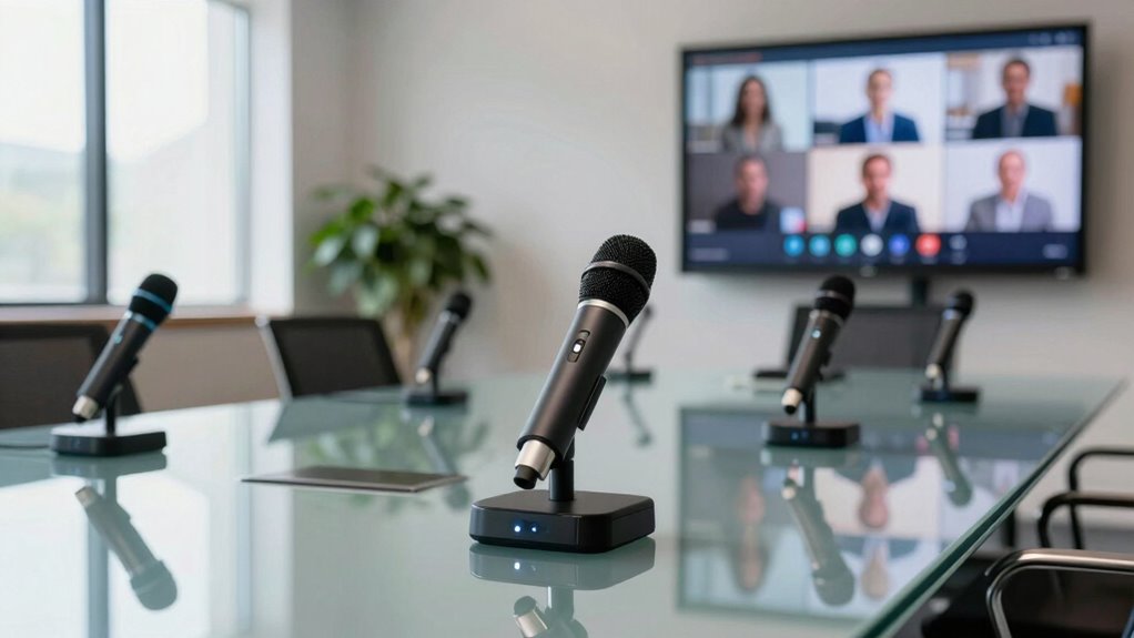 Choosing the right connectivity options can greatly impact your conference room setup for hybrid meetings. I always look for devices offering multiple connectivity choices like USB, Bluetooth, and 3.5mm audio jacks. This guarantees compatibility with various devices. USB-C connections are particularly appealing, as they provide fast, low-latency performance and are becoming the standard for modern tech. Bluetooth is another great option, allowing for wireless operation and flexibility during meetings. Additionally, some microphones come with extra USB ports or hubs, enabling you to connect other peripherals directly. Finally, I make sure the chosen microphone supports plug-and-play functionality to simplify setup and avoid the hassle of driver installations across different operating systems.