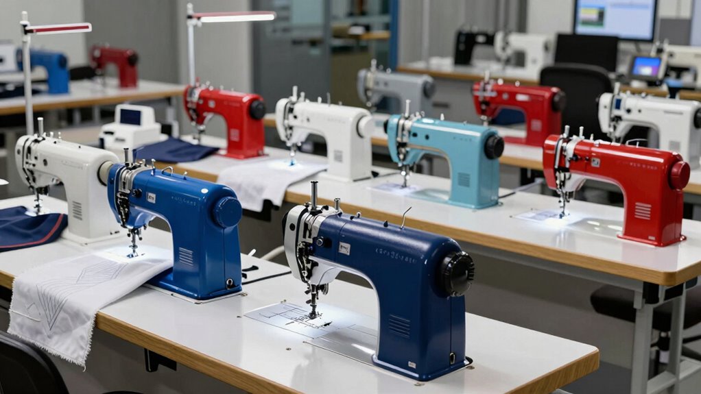 Safety features are essential when producing high-volume stretch garments. I always look for machines with automatic thread cutting, which reduces hand contact and keeps work safe. An emergency stop button is indispensable for quick shutdowns if needed. Proper needle guards and clear safety shields protect against injuries. Additionally, good lighting and ergonomic design help prevent accidents. These features guarantee a safer, more efficient production process, giving me peace of mind.