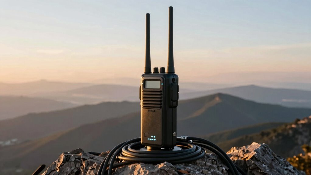 Choosing a digital two-way radio repeater for remote areas means paying close attention to power options and battery life. Some models require an external DC power supply, while others have built-in rechargeable batteries, offering flexibility in deployment. Battery life is vital; many repeaters can operate up to 72 hours on a single charge, depending on usage and conditions. Low power consumption is important for maximizing operational time, especially in off-grid locations. Most portable repeaters are designed to run on batteries, providing maximum mobility without needing mains electricity. When selecting a device, check the voltage specifications—common options range from 3.7V Li-ion batteries to external power sources spanning 5 to 24V DC. Prioritizing efficient power management guarantees reliable communication in remote environments.