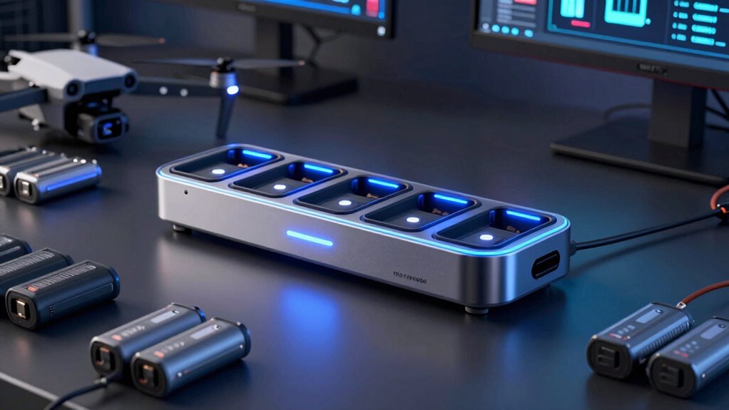 Charging hubs can dramatically boost my drone operation time by reducing downtime. They’re like a well-oiled machine, keeping batteries charged and ready to go without lengthy waits. This efficiency means I can fly longer and complete more missions in less time. By streamlining battery management, these hubs help me maximize my drone’s potential, making my work smoother and more productive every time I take to the skies.