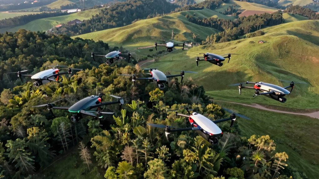 Navigation and safety features are indispensable for ensuring reliable and secure land mapping and environmental monitoring. GPS-enabled drones with auto-return and low-battery auto-landing functions help prevent loss or crashes, especially during extended flights. Obstacle avoidance sensors, like infrared or ultrasonic, reduce collision risks in challenging terrains, enhancing flight safety. Features such as headless mode and altitude hold provide stability and ease of control, even in unpredictable conditions. Maintaining a stable connection through reliable transmission technologies like 5GHz Wi-Fi or long-range RF is essential for real-time control and data integrity. Additionally, regular calibration of the drone’s compass and sensors guarantees accurate navigation, preventing drift and positional errors during prolonged missions. These safety and navigation features are indispensable for successful land mapping and environmental monitoring.