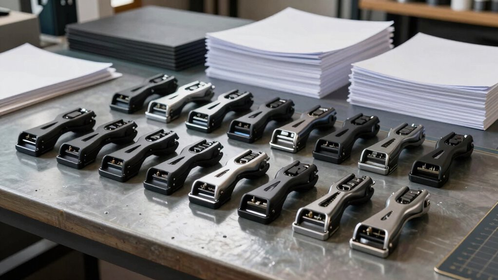 Accurate measurement and alignment tools are essential for achieving clean, precise cuts in a busy studio environment. Many heavy-duty paper trimmers feature dual scales in inches and centimeters, making it easy to measure and position materials accurately. Alignment grids and clear markings, such as 1/2-inch gridlines, enhance visibility and help guarantee straight, consistent cuts. Adjustable paper guides are also important—they maintain uniform cutting dimensions and reduce errors. Well-designed tools save time by minimizing the need for re-cuts and adjustments, boosting overall efficiency. When choosing a trimmer, look for clear, easy-to-read measurement markings and reliable alignment features. These tools are crucial for maintaining precision, especially during high-volume projects where accuracy is essential.