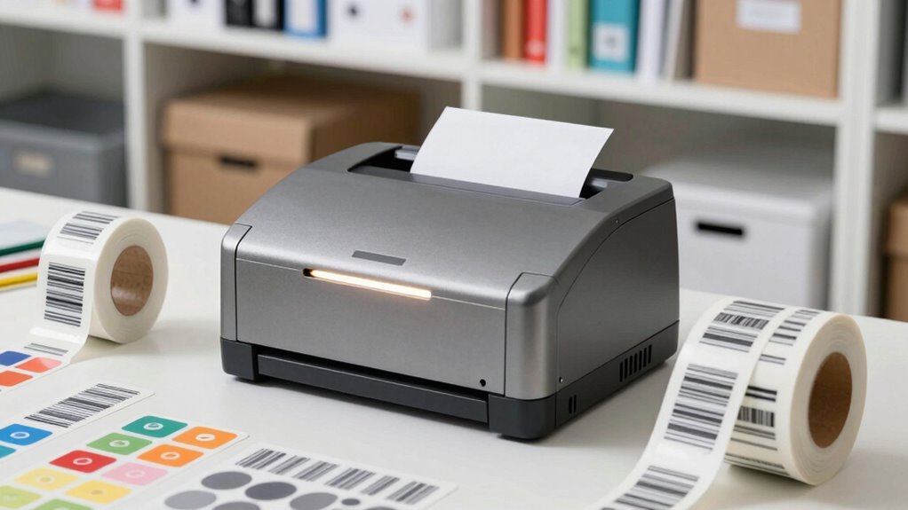 Choosing the right industrial label printer hinges on its compatibility with your existing tools and inventory needs. I look for printers that support a variety of label sizes and types, like shipping labels, barcode labels, and custom labels, to handle different inventory requirements. Compatibility with major operating systems such as Windows and macOS is essential, along with seamless integration with e-commerce and shipping platforms like Amazon, eBay, and UPS. I also prioritize printers that utilize direct thermal or thermal transfer technology for durable, fade-resistant labels. The maximum print resolution, ideally 300 DPI, guarantees clear, professional labels. Finally, I check if the printer allows mobile and PC connectivity, enabling flexible label design and printing via apps or dedicated software. This guarantees smooth, efficient inventory management.