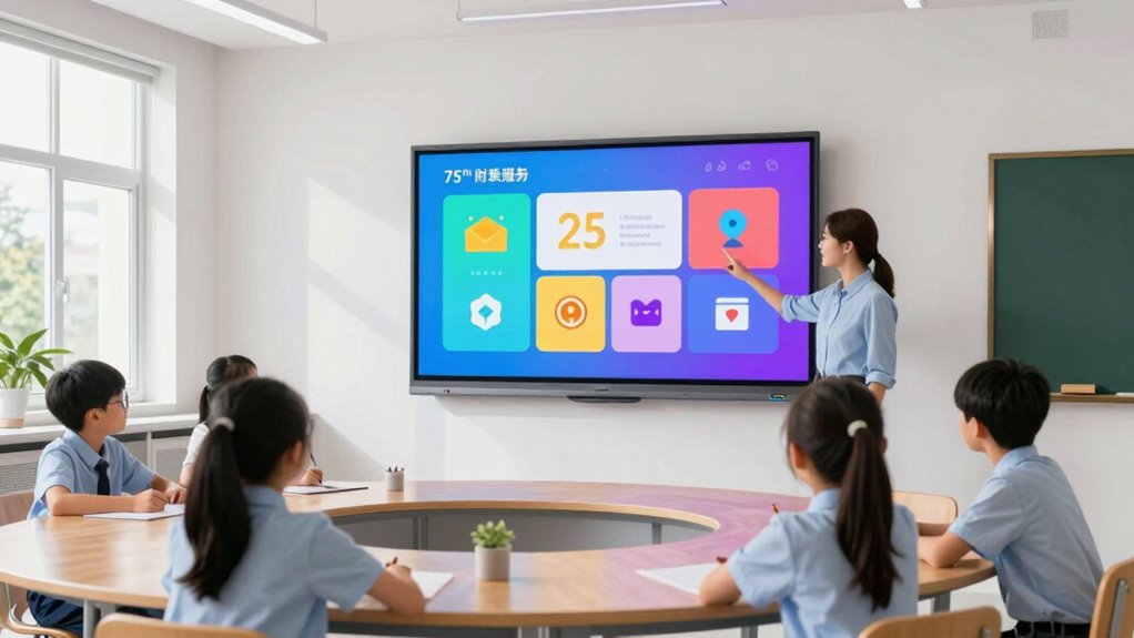 The operating system of an interactive touchscreen display plays an essential role in guaranteeing compatibility with educational apps and software, which directly impacts the learning experience. Displays running on Android OS offer access to a vast array of applications through the Google Play Store, providing flexibility and customization options. Windows-based displays allow seamless integration with traditional desktop software, making them suitable for environments that rely on specific programs. Additionally, the operating system influences user familiarity; educators often prefer systems matching devices they already use, like Android tablets or Windows laptops. Regular updates are also significant, as they improve security and introduce new features. When choosing a display, consider the manufacturer’s update policy to guarantee long-term compatibility and functionality in the classroom setting.