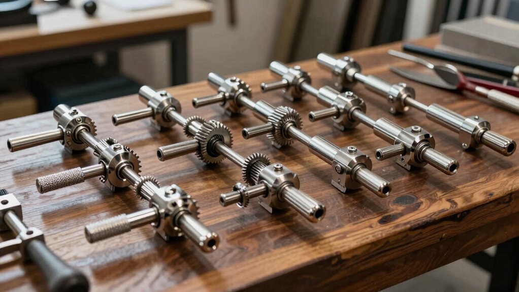 Selecting a jewelry rolling mill with versatile adjustment options can substantially enhance your metalsmithing experience. Look for models with adjustable roller gaps, like T-handle or gear mechanisms, to fine-tune material thickness precisely. Multiple roller configurations—flat, square, semi-circular—expand your design possibilities and allow for diverse shaping tasks. Pay attention to the gear ratio; higher ratios (such as 6:1) reduce manual effort and make adjustments easier. Easily interchangeable rollers or grooves are essential for tackling different jewelry-making projects, adding to the mill’s flexibility. Additionally, consider the range of thickness adjustments, from as thin as 0.01mm to several millimeters, ensuring the mill suits various metals and project requirements. These features maximize versatility and streamline your workflow.