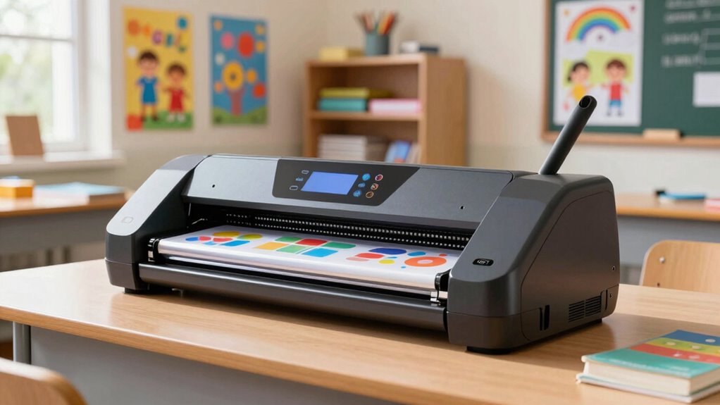How can you guarantee a smooth laminating experience in a busy school setting? User-friendly controls are key. I always look for laminators with intuitive interfaces, like LCD touch screens or simple buttons, that let me adjust film thickness and temperature easily. A responsive design means I can switch between hot and cold modes without fumbling around. Plus, features like a REV system help prevent jams, making it easy to clear misfeeds without damaging my projects. Integrated tools, like built-in trimmers and alignment guides, guarantee precise cuts and straight document alignment every time. Safety features, such as auto shut-off and thermal protection, add peace of mind, allowing me to focus on getting the job done efficiently.