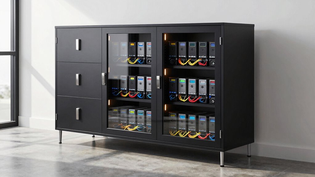Security features play an essential role in choosing the right lockable media storage cabinet for hard drives because they directly impact how well the stored data is protected from unauthorized access. A robust locking mechanism, like a 3-point lock system, greatly enhances security by preventing tampering and unauthorized opening. Controlled access options, such as multiple keys or keyless entry, guarantee only authorized personnel can retrieve drives. Reinforced doors and anti-tipping designs add extra layers of protection against theft and accidental damage, maintaining the integrity of your data. Additionally, selecting cabinets made from durable, scratch-resistant materials helps prevent physical wear, prolonging the lifespan of both the cabinet and the drives inside. Prioritizing these security features guarantees your hard drives remain safe and secure.