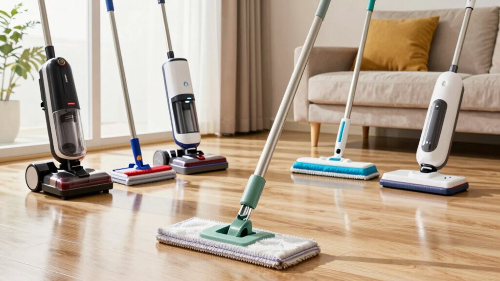 If you’re searching for the 15 best mops for laminate floors in 2026, I recommend options that mix microfiber pads, steam cleaning, and eco-friendly features. Lightweight designs, adjustable handles, and washable pads make cleaning easier while safeguarding your floors. From spray mops to steam models with multi-mode functions, these tools ensure quick, effective, and damage-free cleaning. Keep going to discover detailed insights that help you find the perfect match for your laminate surfaces.
