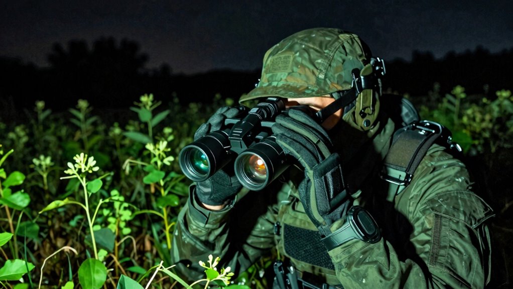 As I assess night vision goggles for fieldwork, image resolution quality stands out as a key factor that directly affects how well I can see and analyze my surroundings. Higher resolution, measured in pixels or megapixels, provides clearer, more detailed visuals, making it easier to identify distant objects or wildlife. Devices with 4K or 8K video capabilities improve the clarity of recorded footage, simplifying scene analysis afterward. A greater resolution enhances digital zoom effectiveness, allowing me to enlarge distant targets without sacrificing image quality. It also boosts low-light performance, capturing more detail in dim conditions. To get the most out of my night vision gear, I look for a balance of high resolution and strong infrared illumination, ensuring sharpness and visibility during my nighttime fieldwork.