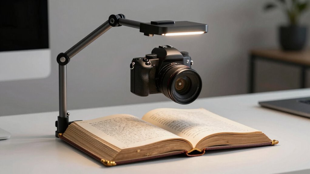 As I picture my workspace transformed by one of these stands, I see a sleek arm reaching over a well-lit book, capturing every detail with clarity. Choosing the right overhead camera stand means inviting precision and ease into your digitizing process. Whether it’s a flexible arm or sturdy tripod, each option helps you create a seamless, professional setup—making your digital archives as vivid and sharp as the moments you cherish.