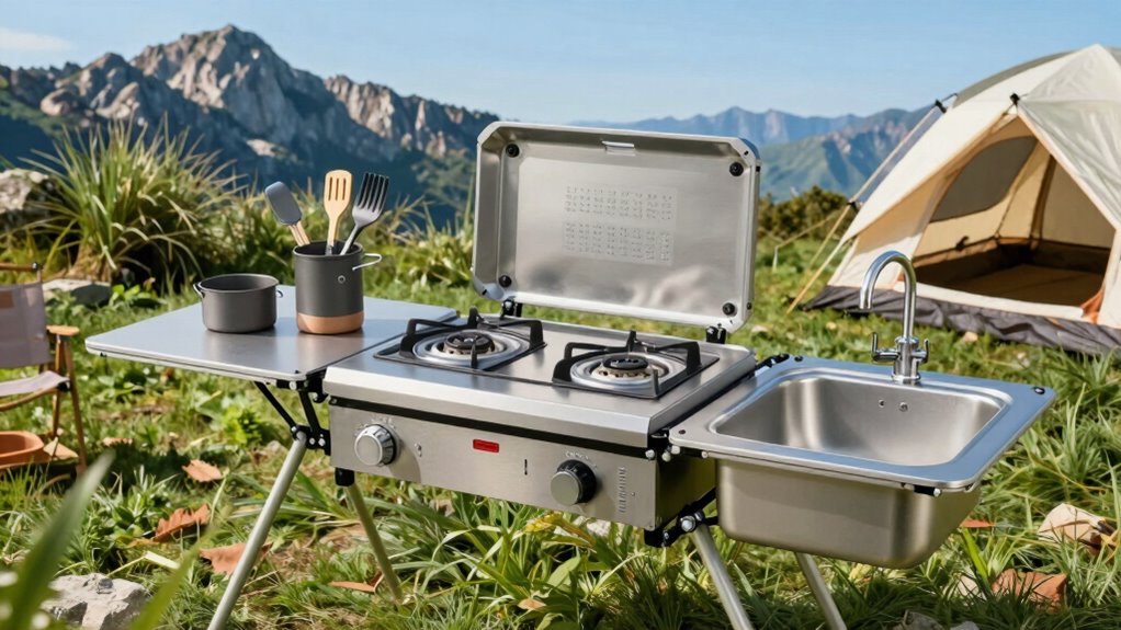 As I pack up my portable kitchen, I realize how these systems turn any campsite into a cozy, organized haven—like finding that perfect spot by the river where everything just feels right. Whether it’s the sturdy fold of a table or the clever storage tucked away, these setups make me feel prepared and free to enjoy every moment. With the right system, camping becomes not just an adventure, but a warm, familiar experience under the open sky.