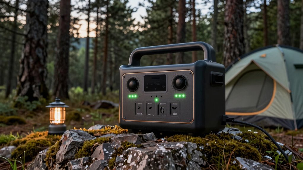 When selecting a portable power station for off-grid camping, it’s essential to take into account its recharging options to keep your energy supply uninterrupted. A versatile station should support multiple recharging methods like solar panels, AC outlets, and car chargers, ensuring you can recharge anywhere. An MPPT controller enhances solar efficiency, especially in changing weather, by optimizing sunlight conversion. The ability to recharge via multiple sources simultaneously, such as AC and solar, reduces downtime and boosts energy availability during extended stays. Fast recharge times—around 3 to 4 hours—are vital to maximize operational hours in remote locations. Additionally, compatibility with various solar panel wattages and types allows for adaptable recharging setups, helping you customize your off-grid power solution based on available resources.