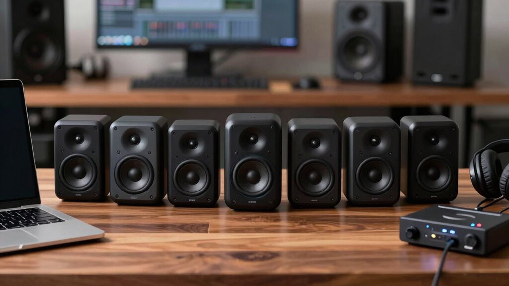 Choosing portable studio monitor speakers that can handle the rigors of travel means paying close attention to their durability and build quality. I look for robust enclosures made from sturdy materials like MDF or reinforced plastic, which can withstand the bumps and jostling of transport. Sturdy connectors and reinforced joints are essential to prevent damage during frequent setup and takedown. Weather-resistant or sealed designs are a big plus, allowing me to use the monitors in various environmental conditions without worry. Compact monitors with shock-absorbing features, such as rubber feet or internal damping, help protect internal components from impacts. Additionally, lightweight construction using high-strength materials guarantees portability without sacrificing structural integrity, making them reliable companions on all my travel editing adventures.