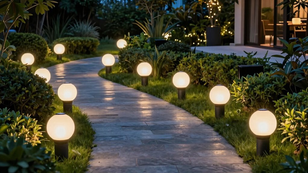 Think of solar pathway lights as low-maintenance garden friends. I find that they do need some occasional cleaning, especially the solar panels, to keep them shining bright. Dirt, leaves, or snow can block sunlight, so I gently wipe them with a damp cloth every few months. This simple act guarantees they perform their best, lighting up your path just like a trusty lantern guiding your way home.