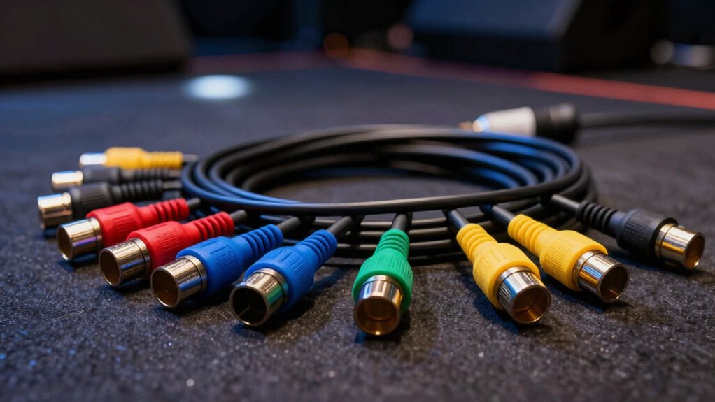 When selecting a stage XLR cable snake, compatibility and connectors are vital to guarantee reliable performance during live events. I always check that the connectors—typically XLR male and female—match my audio equipment’s inputs and outputs. It’s essential they follow the standard 3-pin configuration, supporting most professional audio devices. I also verify whether the cable can handle both analog and digital signals, ensuring seamless integration with my setup. The gender configuration must align with my gear’s connection requirements, whether I need male or female connectors at each end. Finally, I look for connectors made of durable materials like metal or nickel plating, which provide secure, long-lasting connections even during rigorous live performances. Proper compatibility prevents signal loss and guarantees smooth operation.