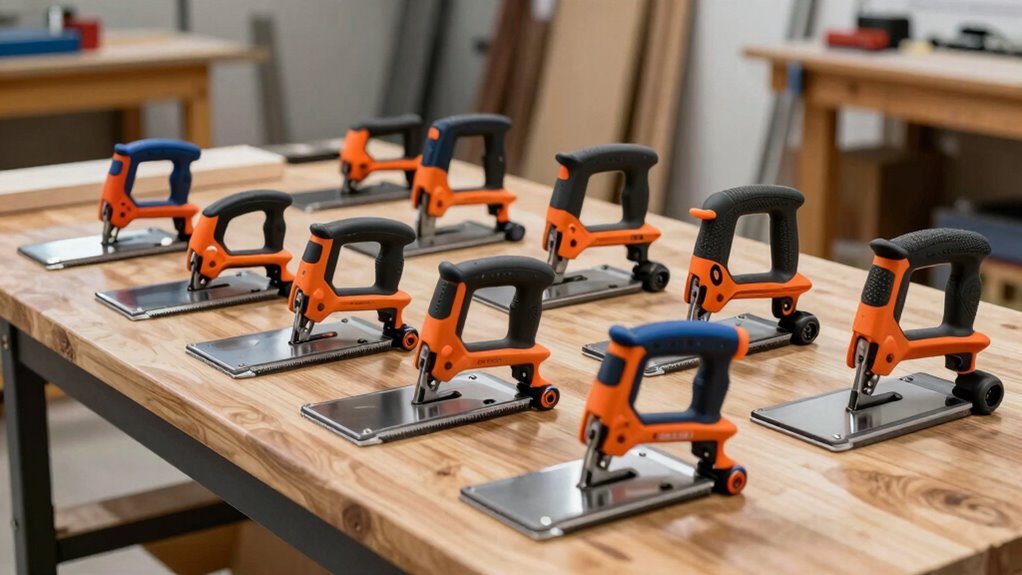 When choosing a track saw, prioritizing safety features is vital to guarantee both your safety and the quality of your work. Features like riving knives and anti-kickback mechanisms considerably reduce the risk of accidents during cutting. Clear, easy-to-activate blade guards improve visibility and help prevent injuries. Dust collection ports connected to vacuum systems keep your workspace cleaner and reduce inhalation hazards. Anti-slip bases and stabilization mechanisms ensure the saw stays steady, lowering the chance of slips or kickbacks. Additionally, adjustable safety controls like lock-off switches and safety triggers prevent accidental activation. These safety features not only protect you but also contribute to more precise and confident cuts. Considering these safety elements is essential when selecting a track saw for professional or DIY use.