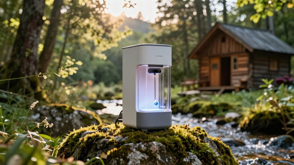 Opting for a UV water purifier with minimal environmental impact is essential for sustainable off-grid living. These systems eliminate harmful microorganisms without creating chemical by-products, which helps reduce water pollution. LED UV technology uses far less energy than traditional mercury lamps, lowering your carbon footprint. Since they’re mercury-free, these purifiers avoid hazardous waste issues linked to toxic lamp disposal. Long-lasting LED components mean fewer replacements, reducing waste and conserving resources over time. Additionally, chemical-free UV purification preserves water’s natural chemistry, eliminating the need for chemical additives that can damage ecosystems. Choosing environmentally friendly UV purifiers not only ensures clean water but also supports eco-conscious living, making them an ideal choice for off-grid setups committed to sustainability.