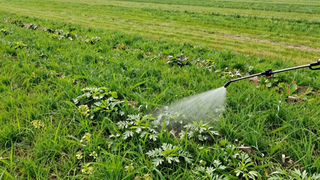Think of commercial weed application like steering a ship—precision and caution are key. I always wear protective gear, follow label instructions carefully, and keep others away during spraying. I also check weather conditions to prevent drift and guarantee proper disposal of unused chemicals. These precautions help protect both me and the environment, making sure my large-scale weed control is safe, responsible, and effective.